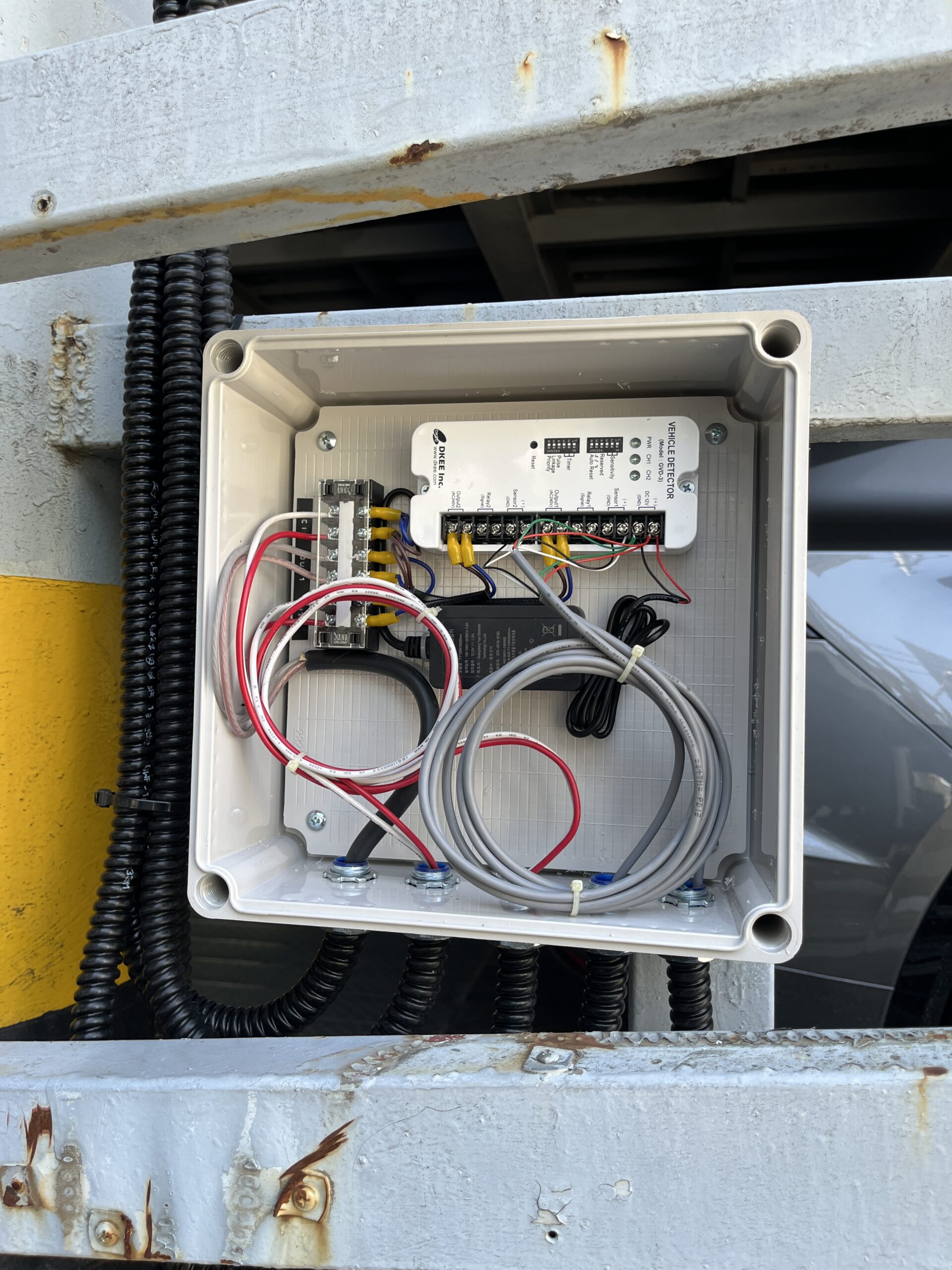 This vehicle detector detects metal moving in front and behind the sensor, so the installation location must be checked.